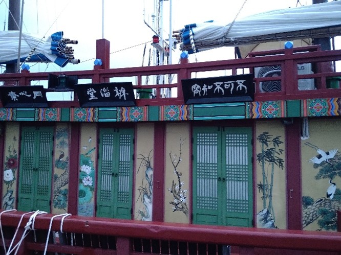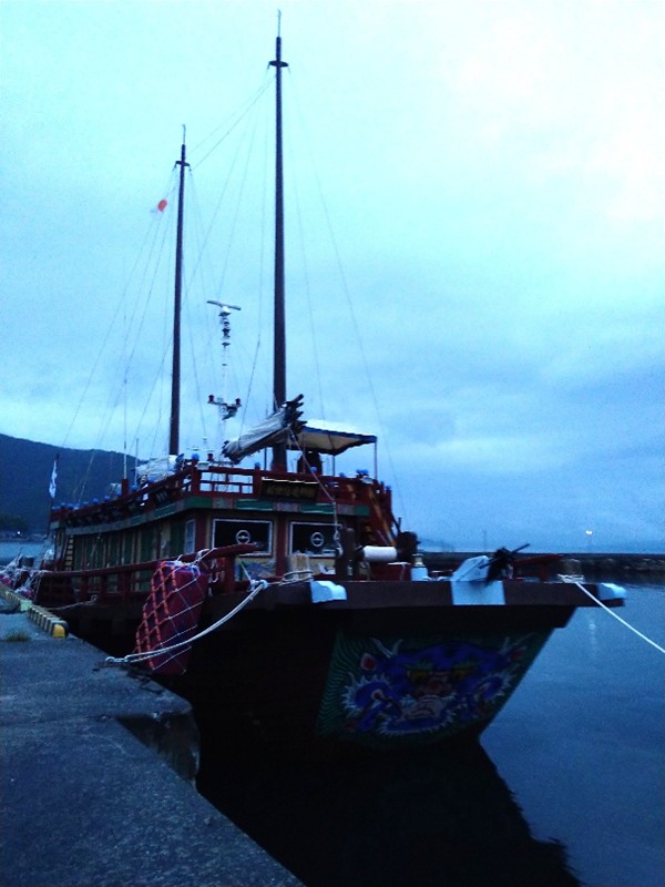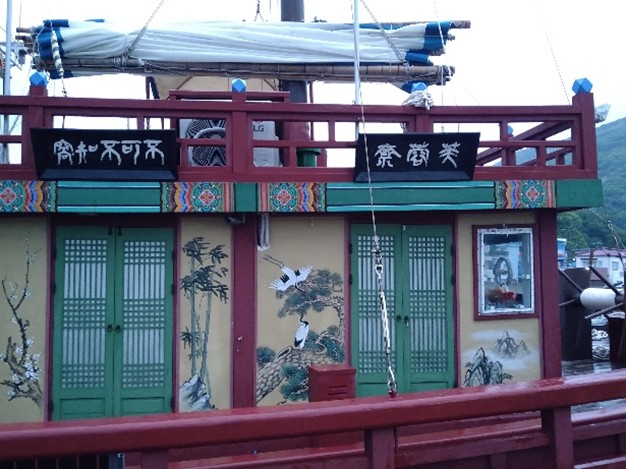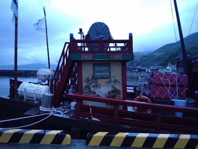 今年の5月21日に、大阪・関西万博にあわせて1764年以来、261年ぶりに朝鮮通信使航路を再現することとなり、朝鮮通信使船の復元船が室津港に寄港しました。かつて上関町には11回寄港した記録が残っています[iii]。往路でも寄港する予定だったのですが、あいにくの雨で風も強かったため、復路のみの寄港となりました。外側からだけでしたが実際に再現船を見たことで、歴史の流れやロマンだけでなく、見た目も特徴的で当時の技術力を感じました。貴重な体験ができたと思います。以下はその時の写真なのですが、雨の中撮影したため見えづらいかもしれません。